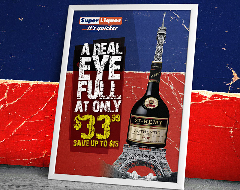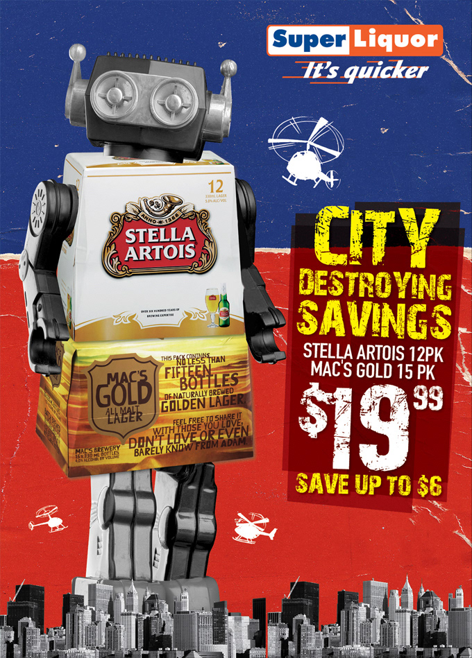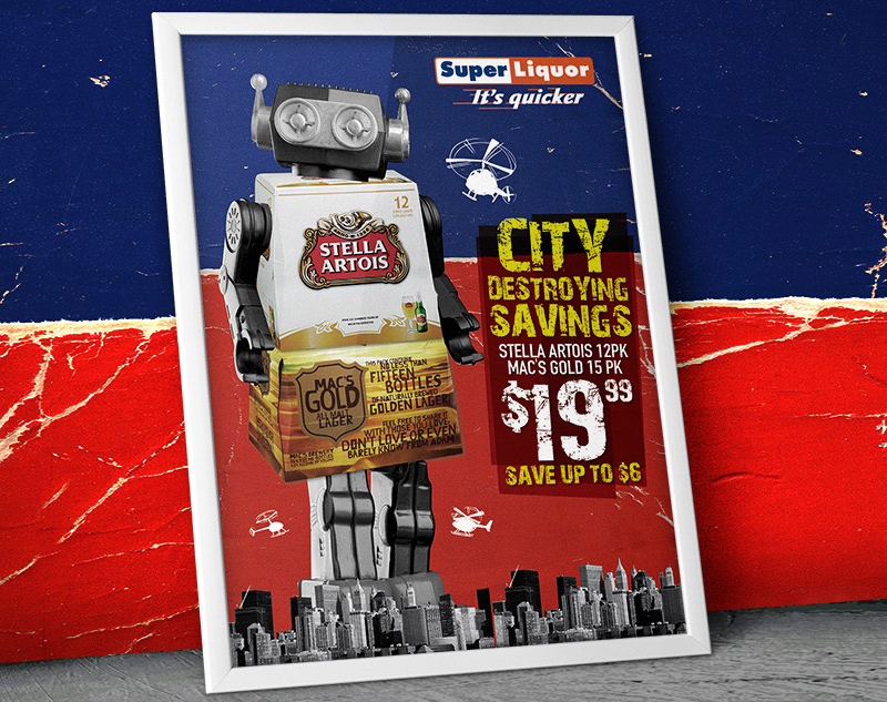 We've been lucky enough to work on Super Liquor twice, below is a look we created based on a brief to create a red and blue look that combines one or 2 products with black & white stock imagery. The products, for the first campaign, we had to work with were a Stella 12 pack & Mac’s Gold 15 pack, and after pitching the below robot idea, client said ‘This is the benchmark we use for this campaign from now on.'