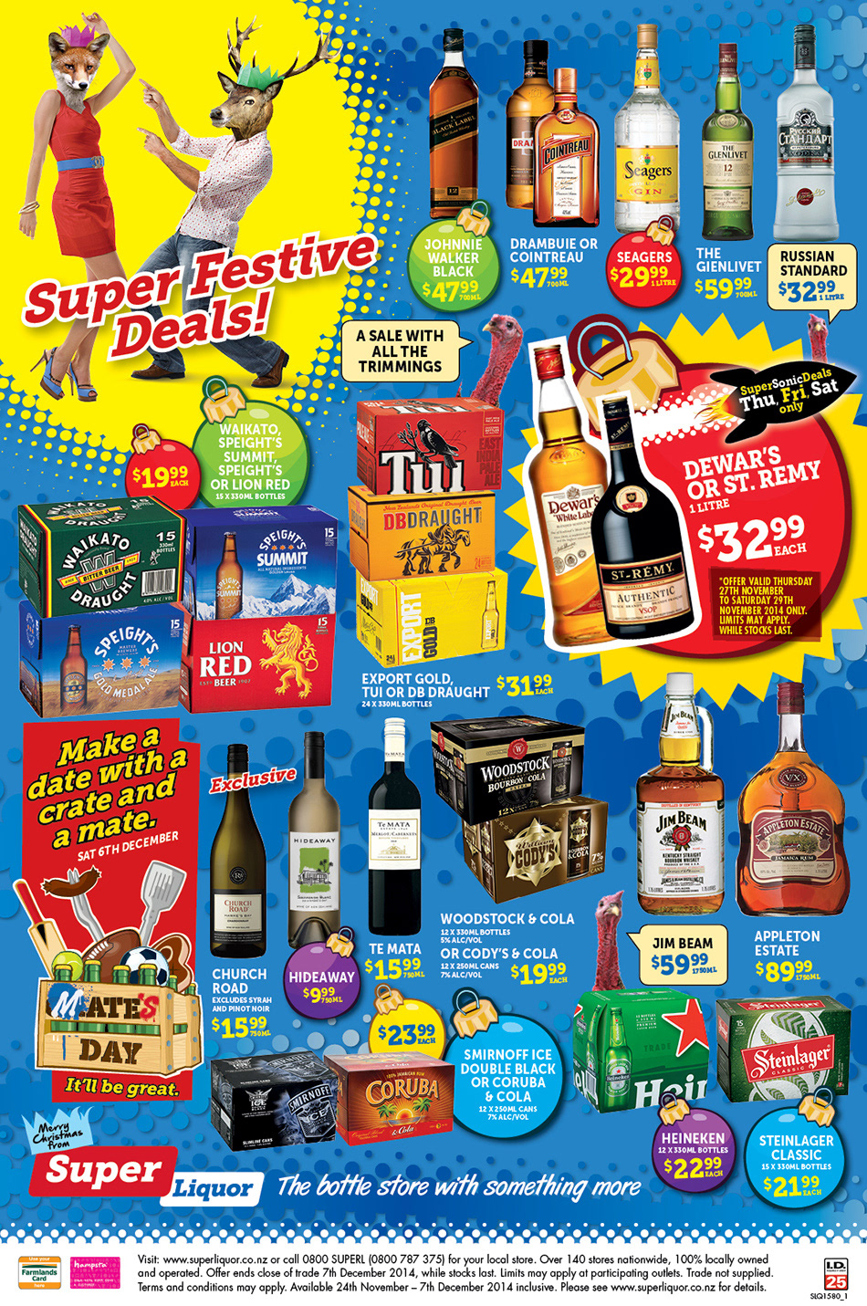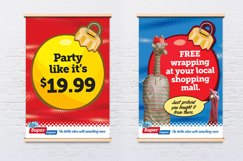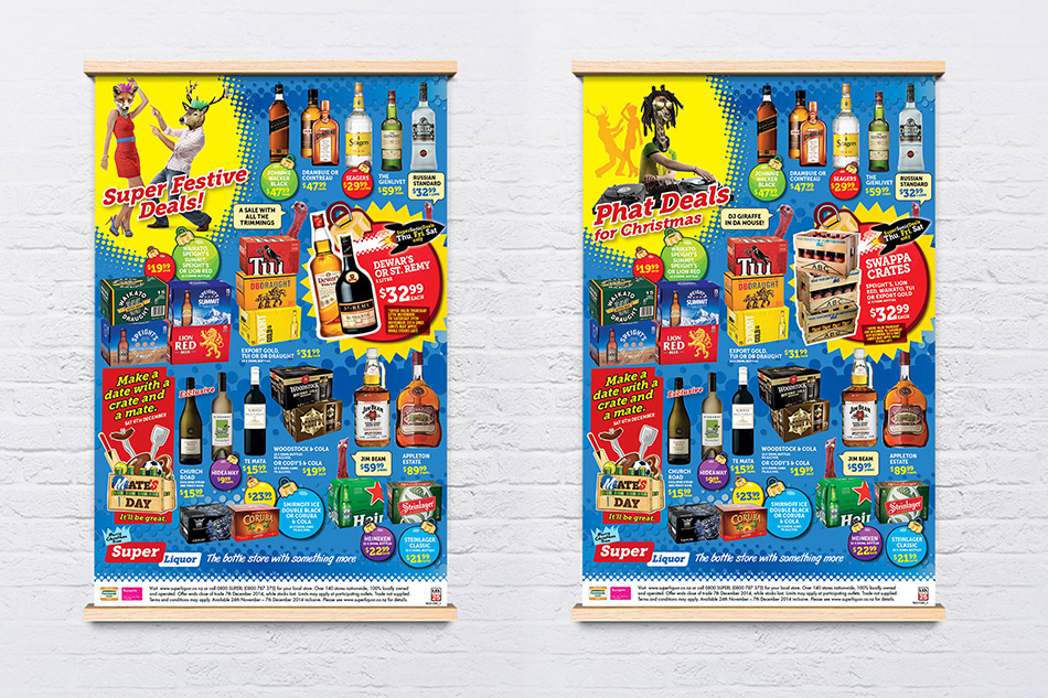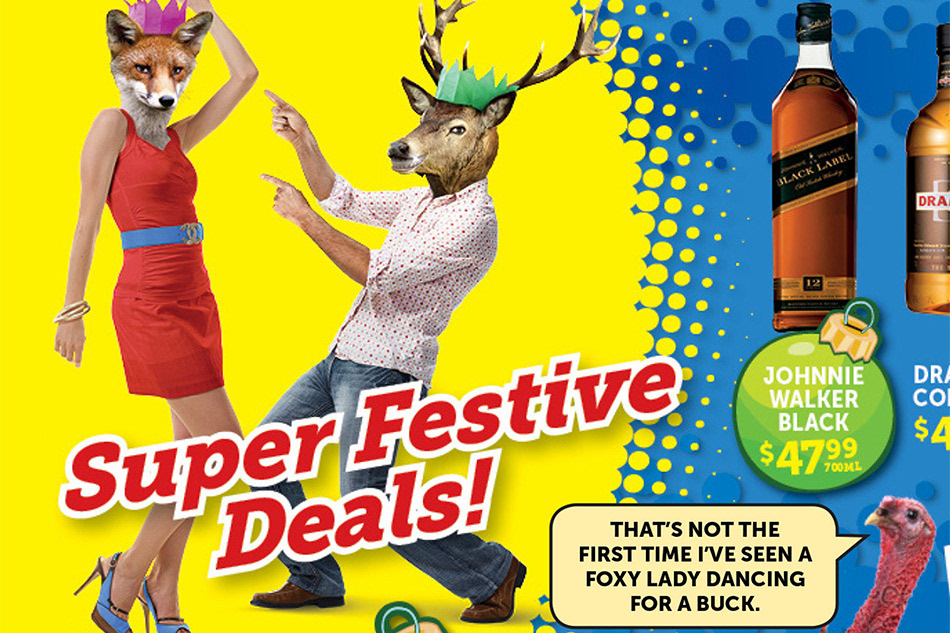 Our second stint on Super Liquor was just after their agency had successfully pitched a rebrand for them. This time around the look and feel was more polished with all the concepts based around 3 characters, a mandrill, a buck, and a giraffe (we added a 4th for Christmas, a foxy fox). The work below is a selection of how we brought the rebrand to life (retail bosters, brand posters, and a Facebook 2015 Christmas countdown).