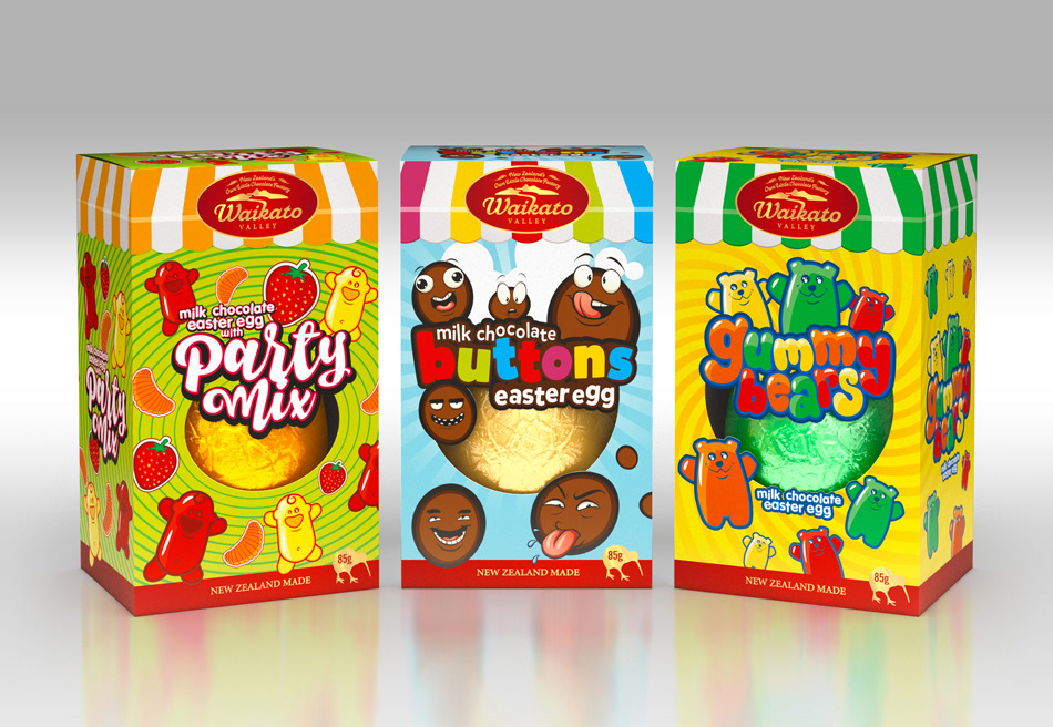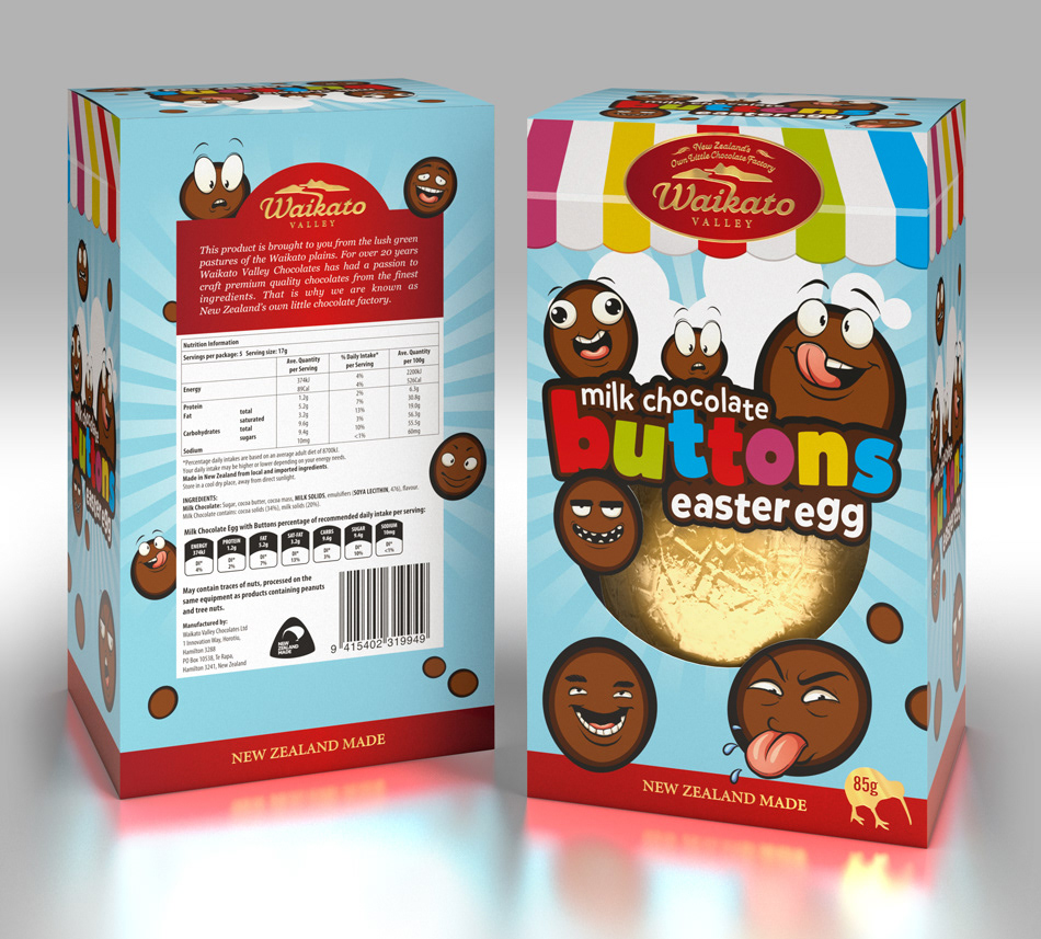 One of many packaging projects at The Warehouse Group was for three chocolate Easter Eggs. We were provided the names, flavours, and a die cut template to work to. We illustrated every background, type lock-up, and all characters, except the faces on the chocolate buttons; I used stock for those, as the button faces we illustrated, to quote the client, "would scare children".