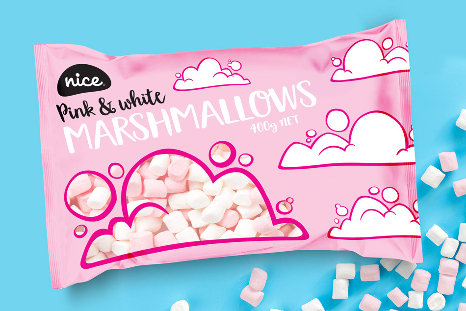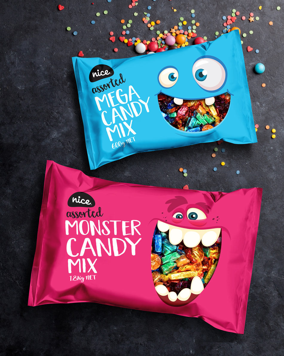 2 designs we created for another of The Warehouse's home brands. We hand drew and then vectorised the clouds for 'Nice Marshmallows' and we used iStock for the 2 'Mega candy' Mixes. The idea behind both these were a simple flat colour with the main cloud and the mouth of the monsters showcasing the products within.